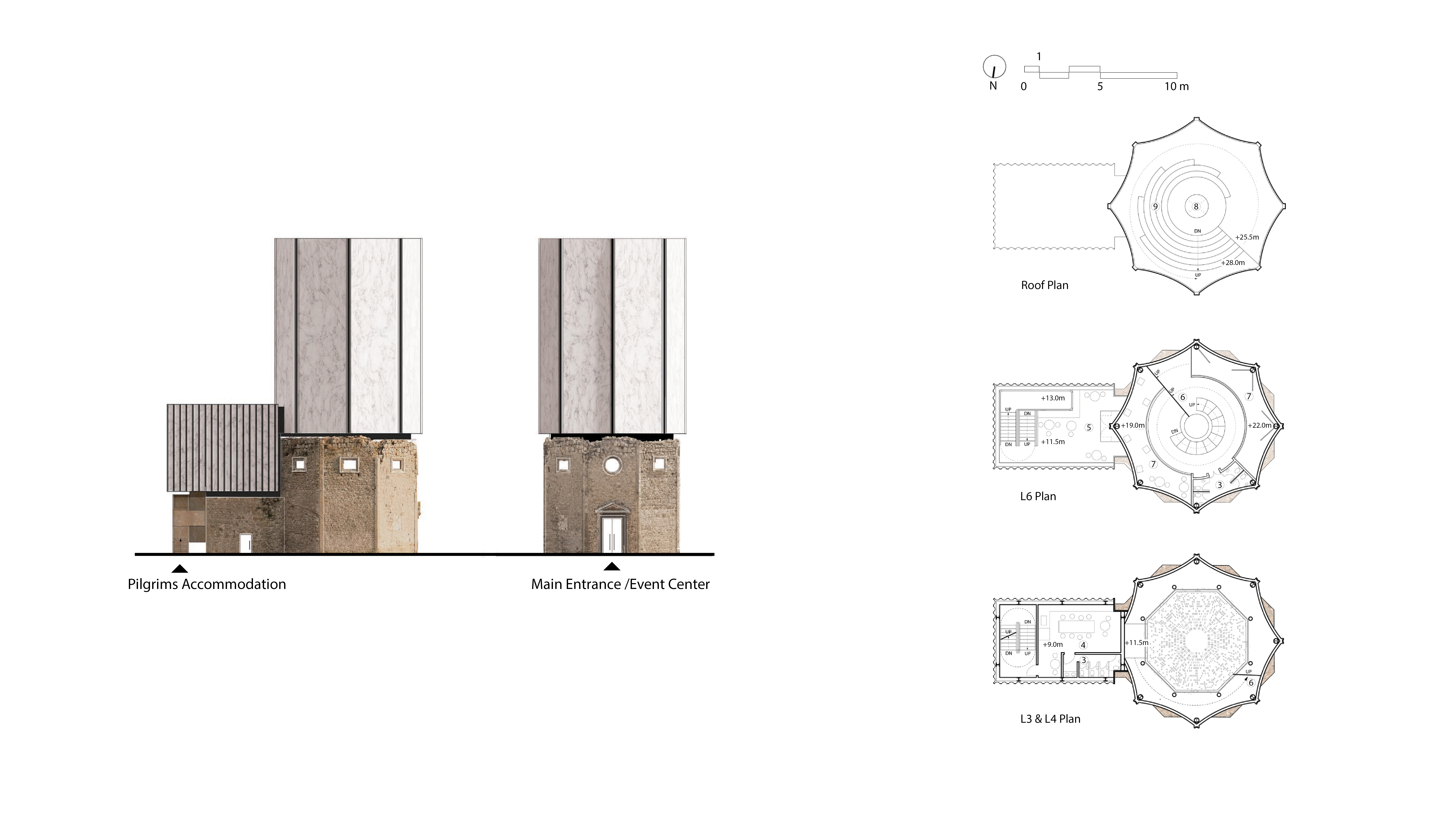 The design ethos embraces historical context while pursuing monumentality. Atop the existing chapel, a monolithic and elegant octagonal addition rises, featuring a modern interpretation of a historical roof. This addition houses a gallery, library, and an open auditorium, promoting a harmonious blend of tradition and modernity. A new annex massing on the east side, replacing the previous crippled roof, connects seamlessly to a pilgrim’s accommodation, communal kitchen, dining hall, and a programed terrace via a graceful staircase.
