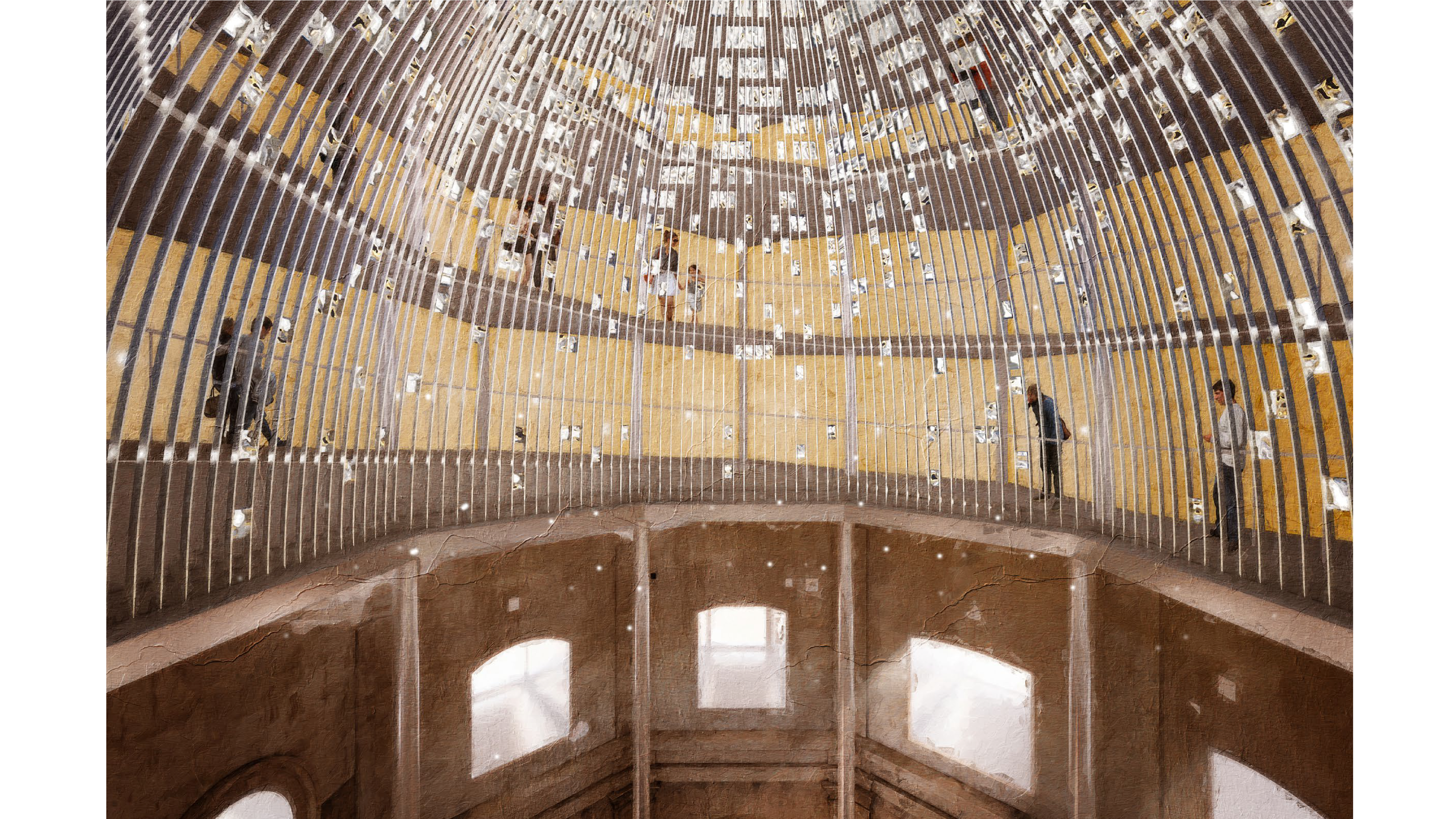 Externally, the Beacon’s façade, clad in backlight concave marble panels with a refined monochromatic texture, transforms into a numinous beacon when gently illuminated at night, visible from afar. The golden ratio guides the reconstruction of the historical roof geometry, fostering a visual dialogue with the existing structure and employing shimmering textures inspired by lake ripples. A pathway to the roof, nestled between the exterior wall and interior dome, unfolds a sensory journey enriched by galleries, archives, and books, culminating in an open auditorium with breathtaking views of Lake Bolsena.