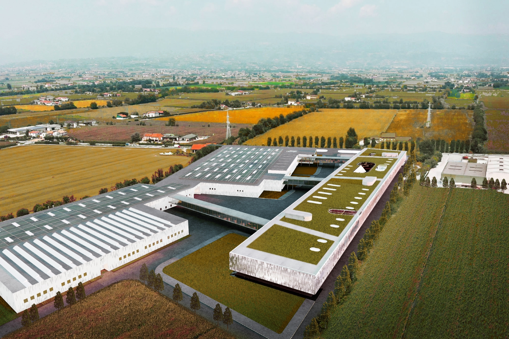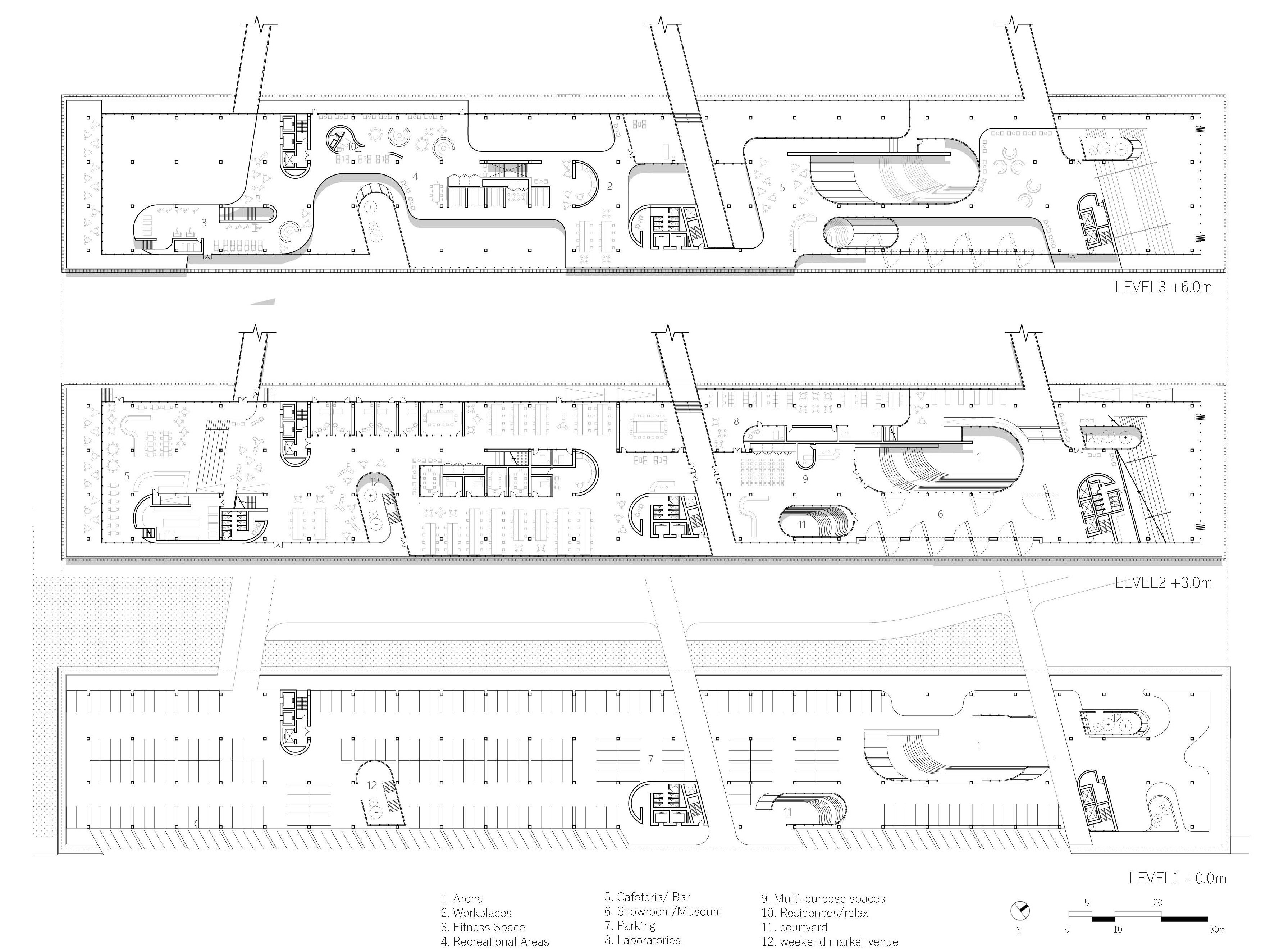 A central bridge delineates the programmatic zones. The north houses public-oriented spaces like the arena, indoor auditorium, and multipurpose areas, while the south is dedicated to modern, efficient workspaces enriched with amenities supporting health and wellness initiatives. Cylindrical voids punctuate the floating mass, creating purposeful “wells” inspired by FITT’s liquid transferring system. These wells serve diverse functions such as cores, courtyards, employee entrances, and an open arena— a symbolic focal point reminiscent of Italy’s urban plazas, complete with water features and lush vegetation, fostering communal interaction.