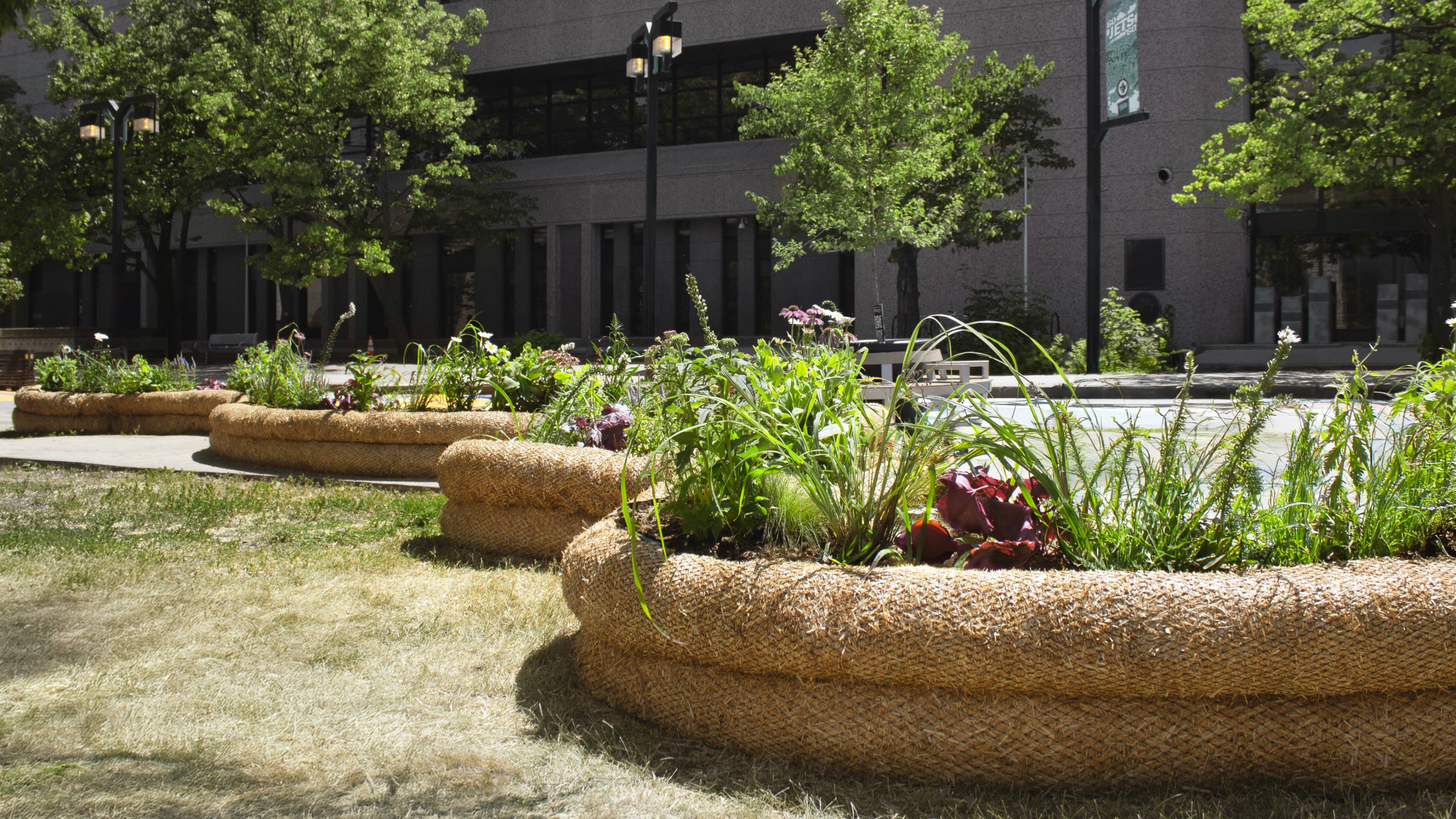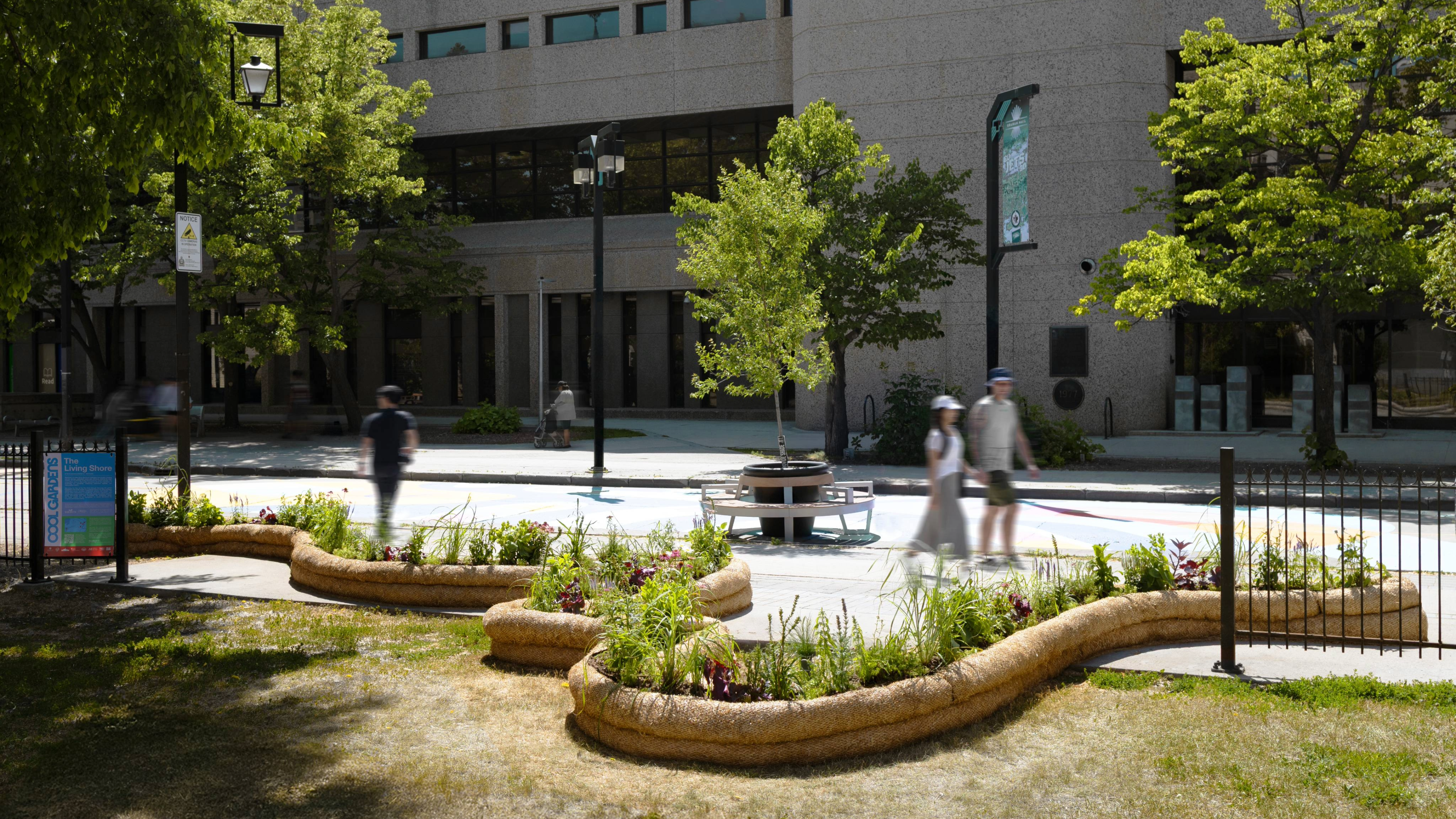 Organized by Storefront Manitoba, Cool Gardens is an annual public art and design exhibition that has animated at various locations in downtown Winnipeg since 2014. The Living Shore installation is made possible through the generous support of local manufacturer ECBVerdyol, who supplied the straw wattles, and Urban Jungle, a Winnipeg-based contractor who led construction. To ensure public safety, the straw wattle material was specially treated with spray-on fire-retardant.