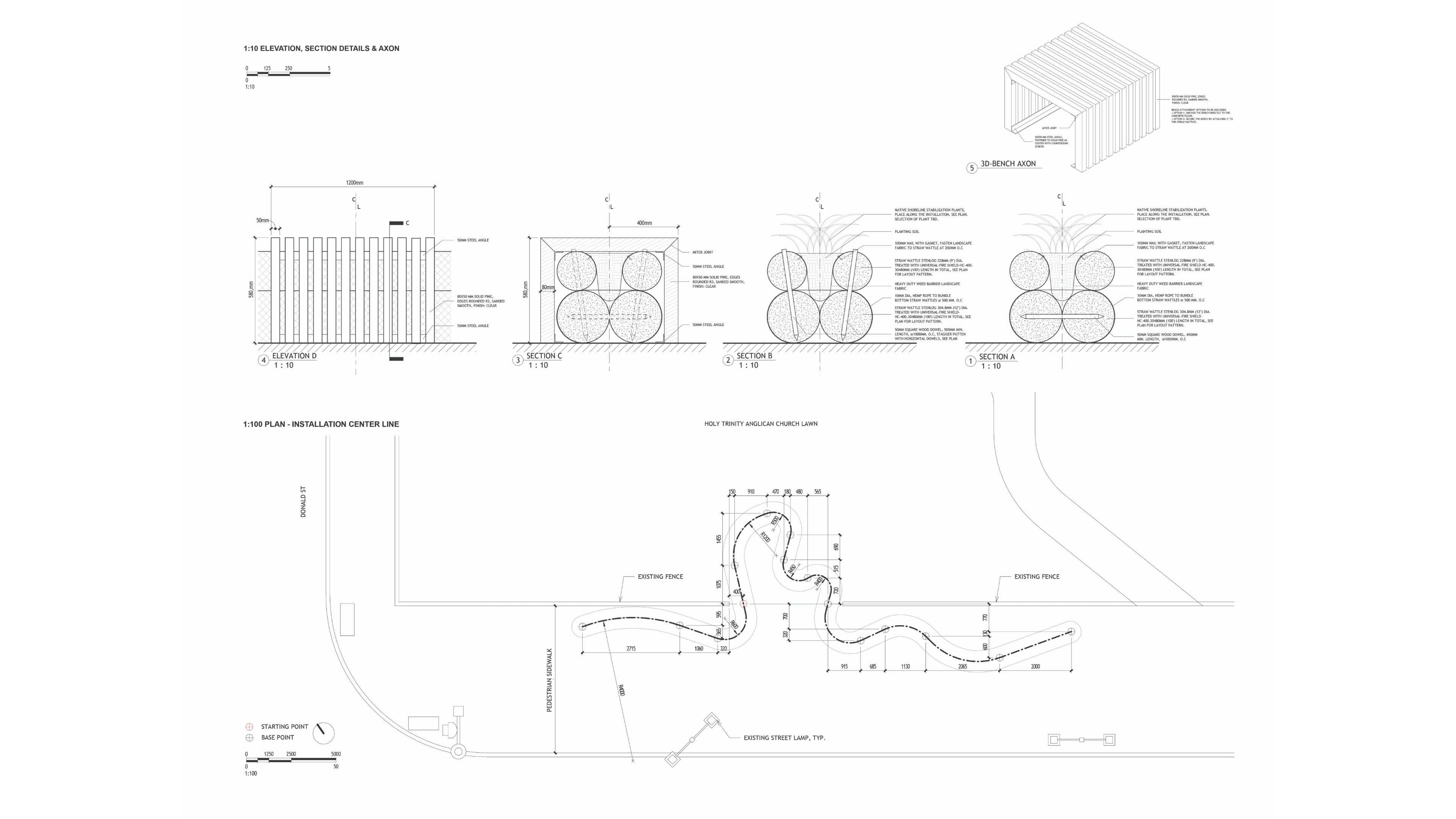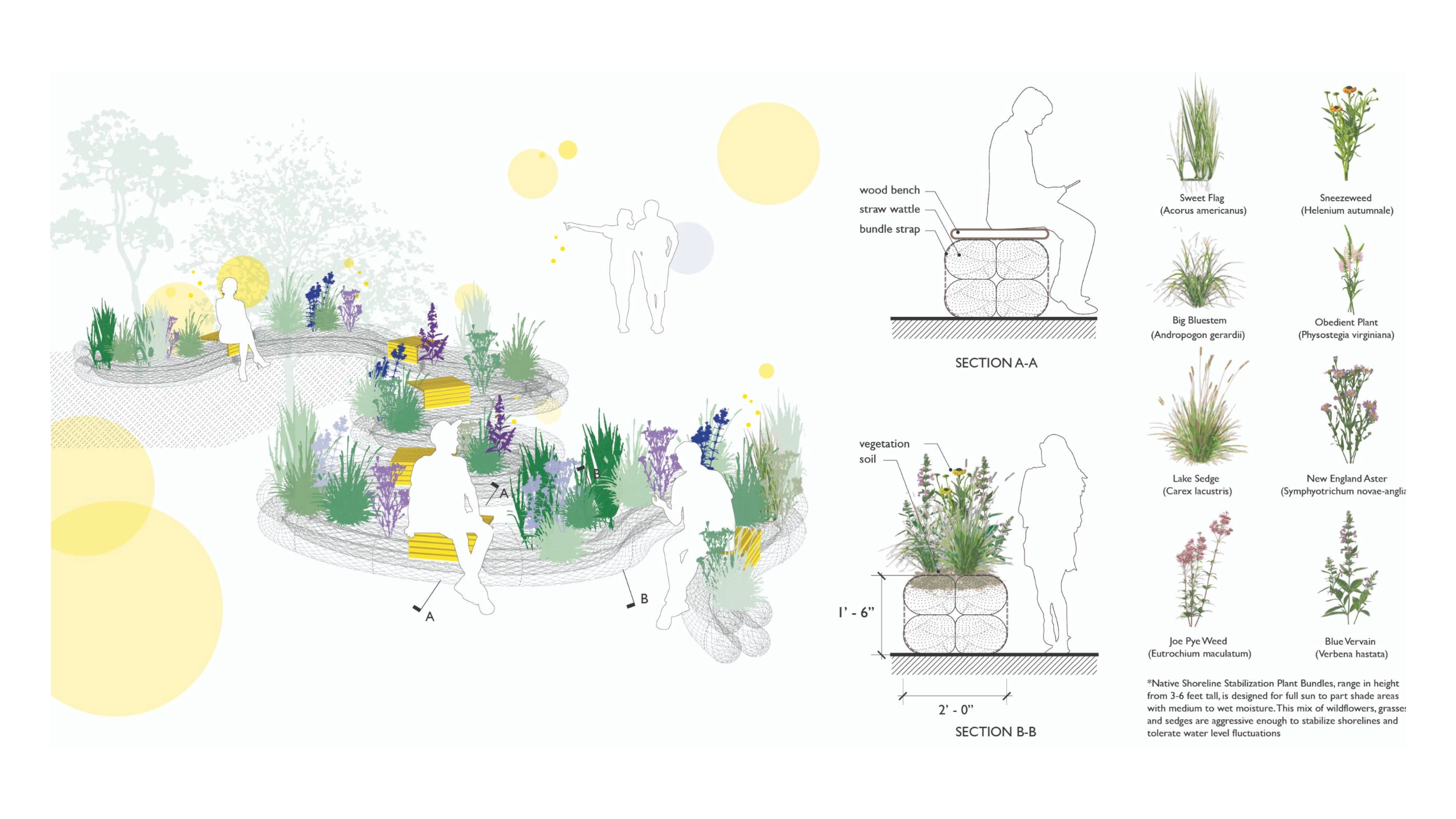 This installation reimagines the hardscape as a soft, living system. Through the creative use of straw wattles and biotic earth, the project constructs a planted shoreline simulation filled with native grasses, sedges, and wildflowers. The two layers of wattles are fastened using concealed wooden dowels to form a vessel to house the plants. The meandering form echoes the Red River’s path, inviting visitors to walk, pause, and engage with the garden installation. Beyond its symbolic gestures, the Living Shore proposes a sustainable and artistic representation of shoreline restoration technique— the same materials used here can be recycled to long-term stabilization efforts of Manitoba’s waterfronts.
