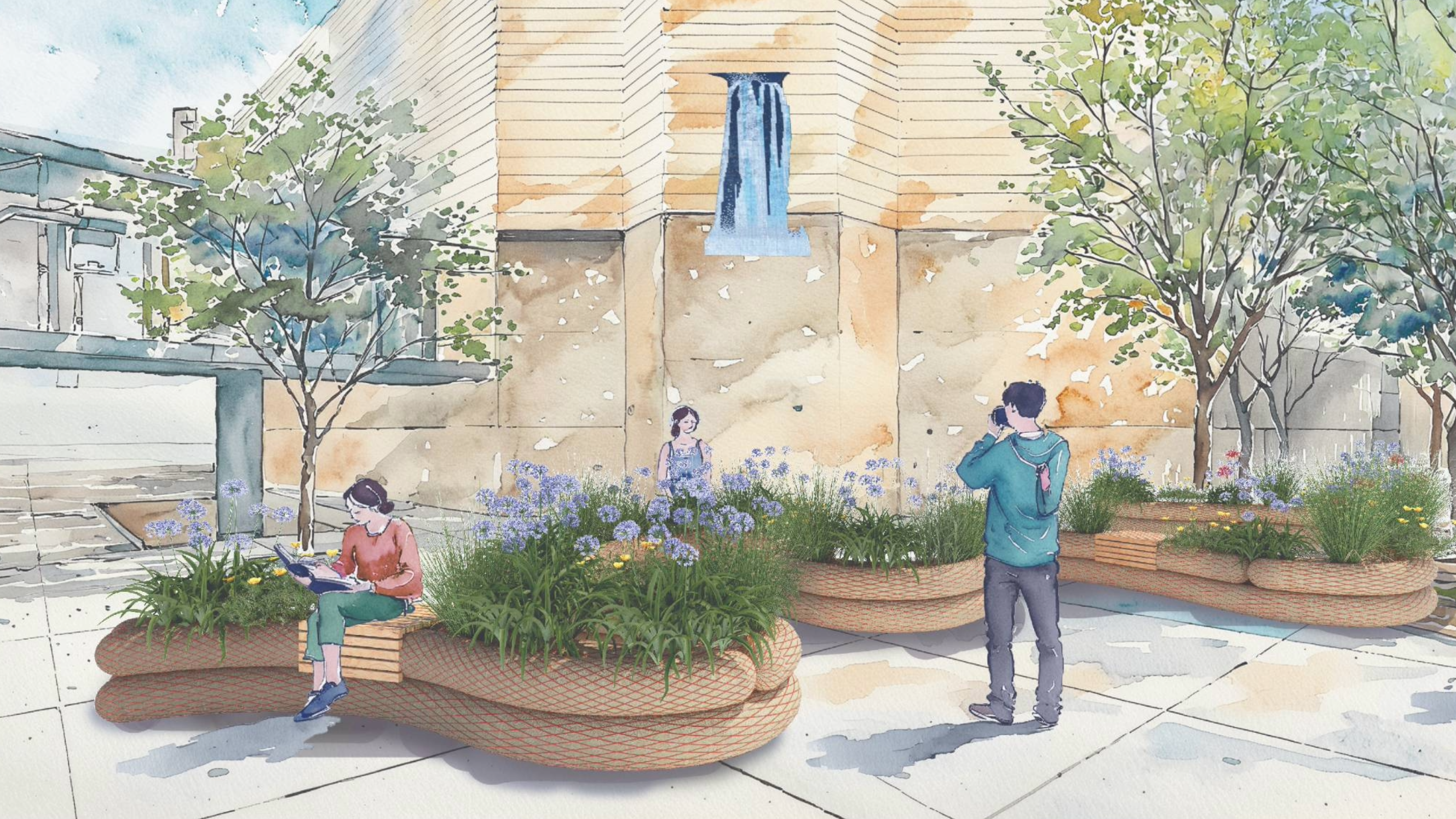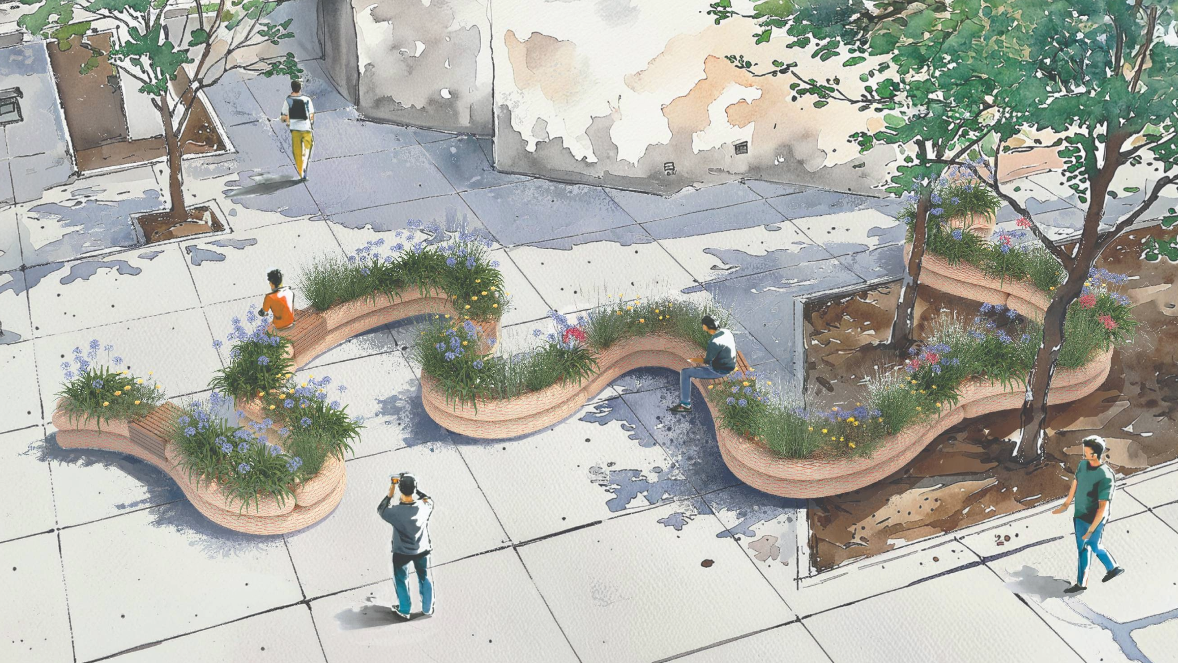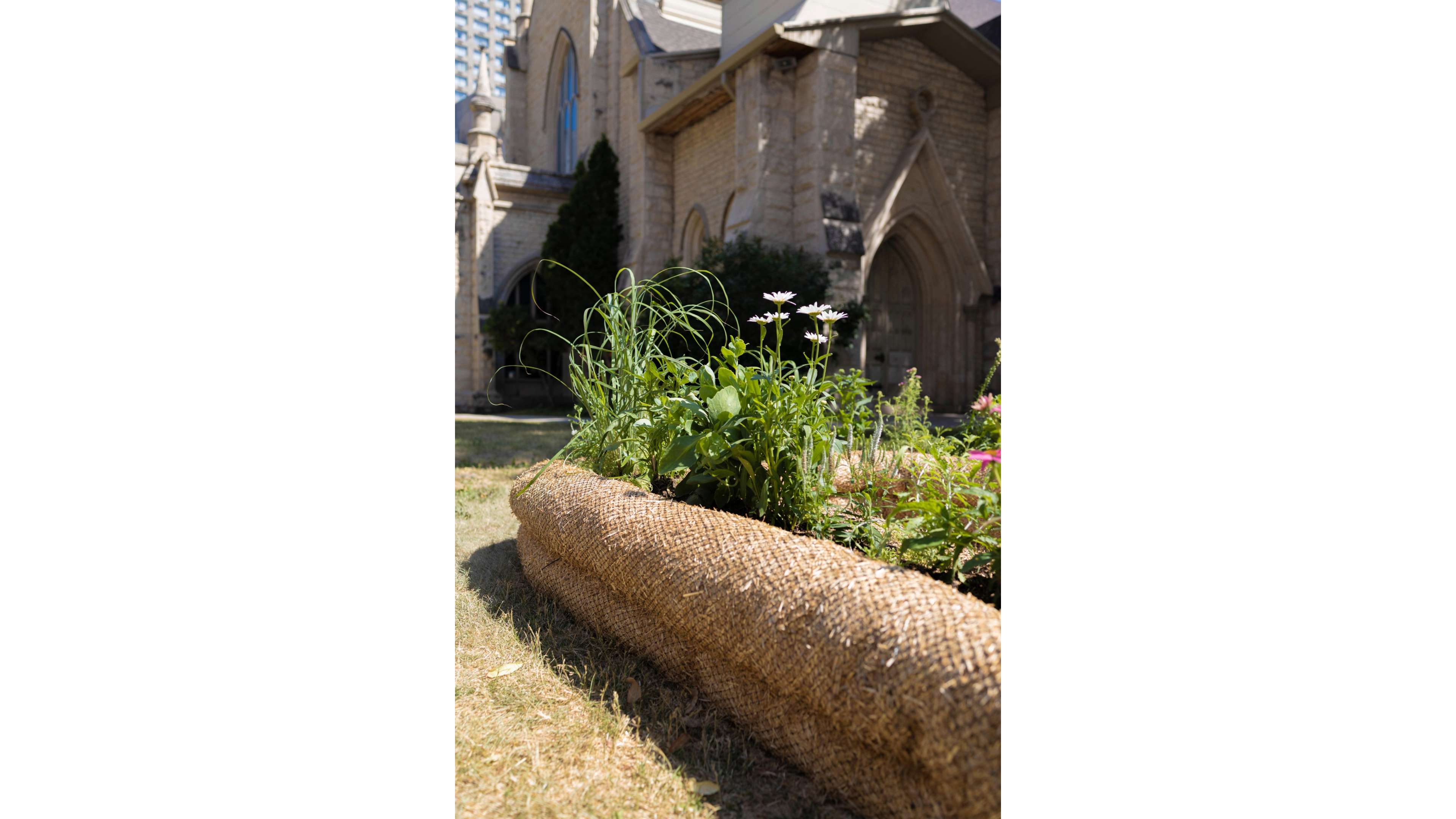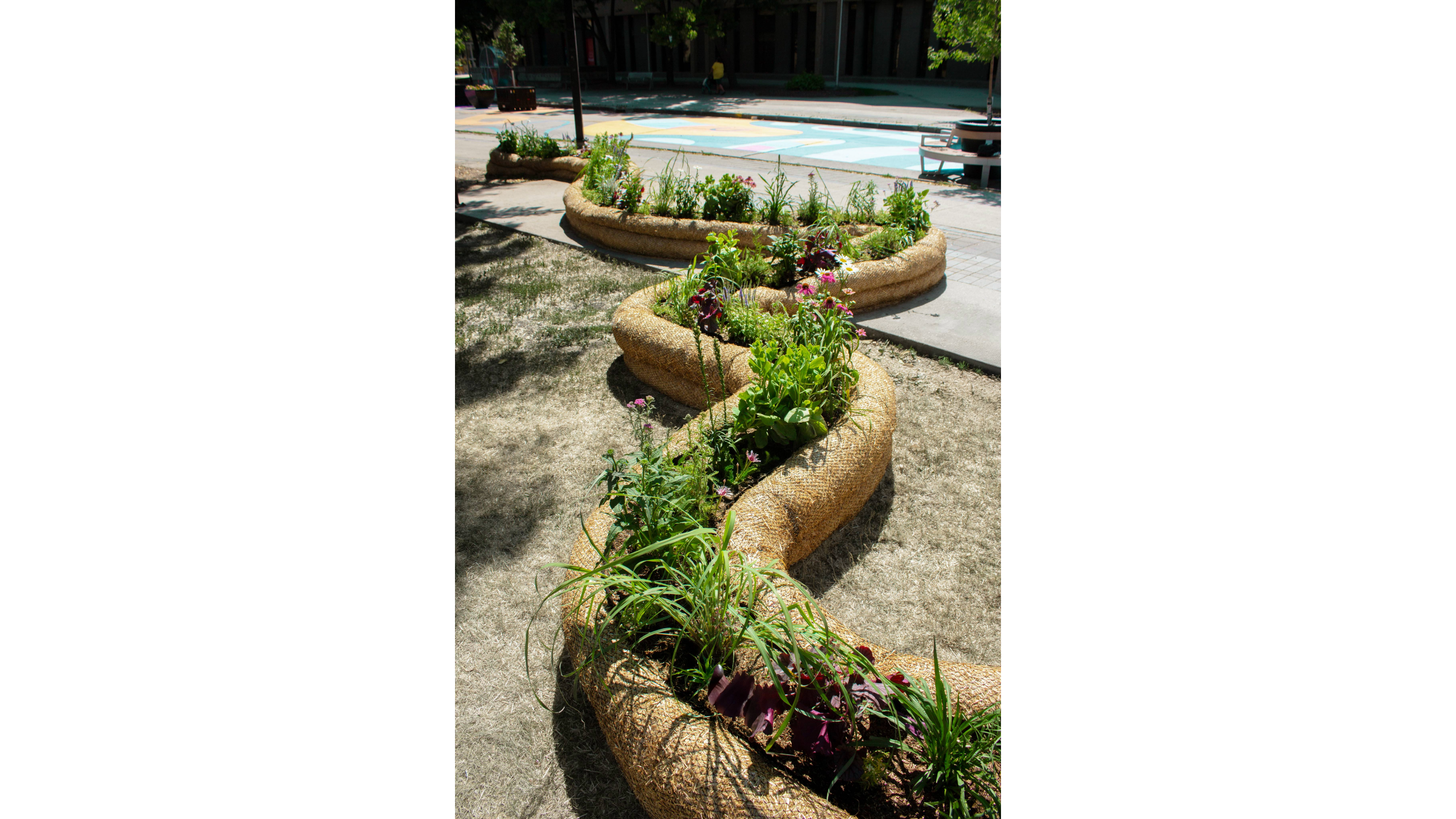 Art Meets Ecological Infrastructure. As part of Winnipeg’s 2025 Cool Gardens and the City’s “Reimagining Graham Avenue” initiative, the Living Shore is a temporary landscape installation created by Nyta Design, located at the intersection of Graham Avenue and Donald Street in downtown Winnipeg. Drawing inspiration from Manitoba’s extensive yet increasingly vulnerable shorelines, the project explores a speculative, artistic approach to create a urban ecological infrastructure using straw wattles — a sustainable, biodegradable erosion control material derived from local agriculture.