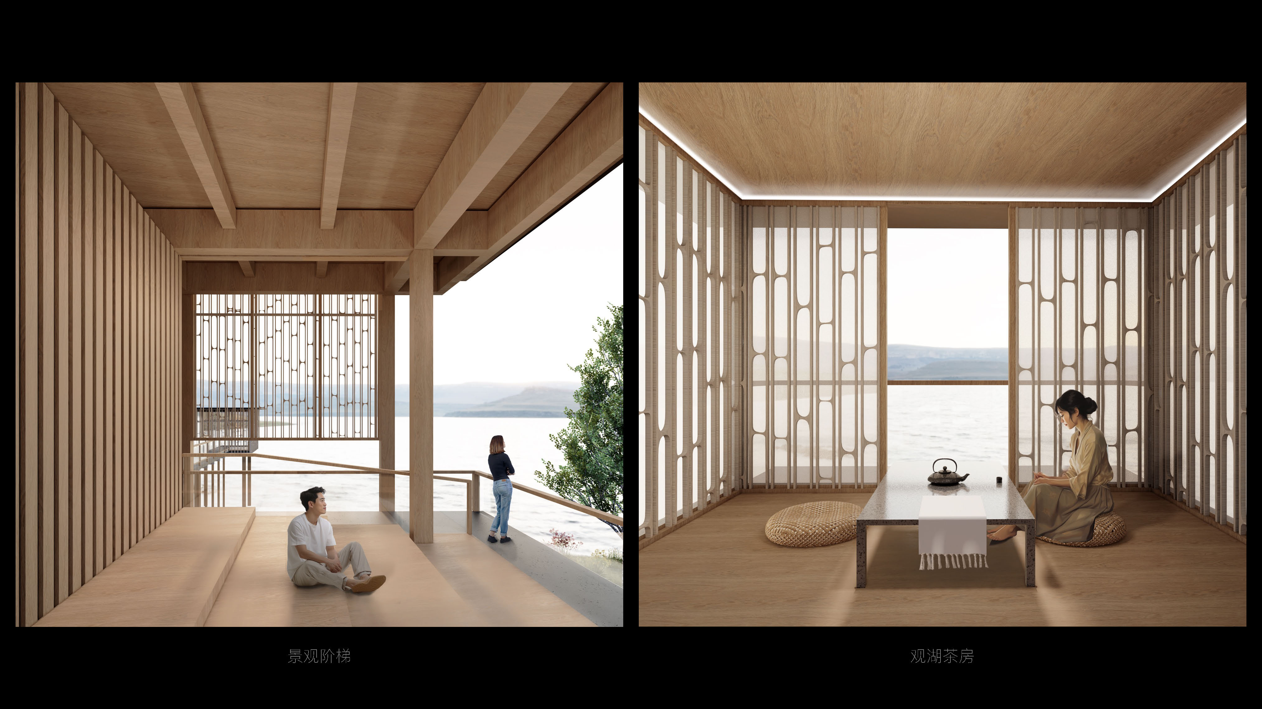 “Amidst Gently Flowing Waters.” In a translucent manner, let nature permeate through itself, and let the architecture become a filter for sunlight, sight, mountains, and water. The “Lemna” Art Exhibition Center preserves the scenic view from the square to the lake at the architectural scale. The wooden structure of the exhibition center rises from the lakeside, covered by an evenly spaced bamboo skin, creating a rhythmic facade that appears to be moored on the water from a distance.