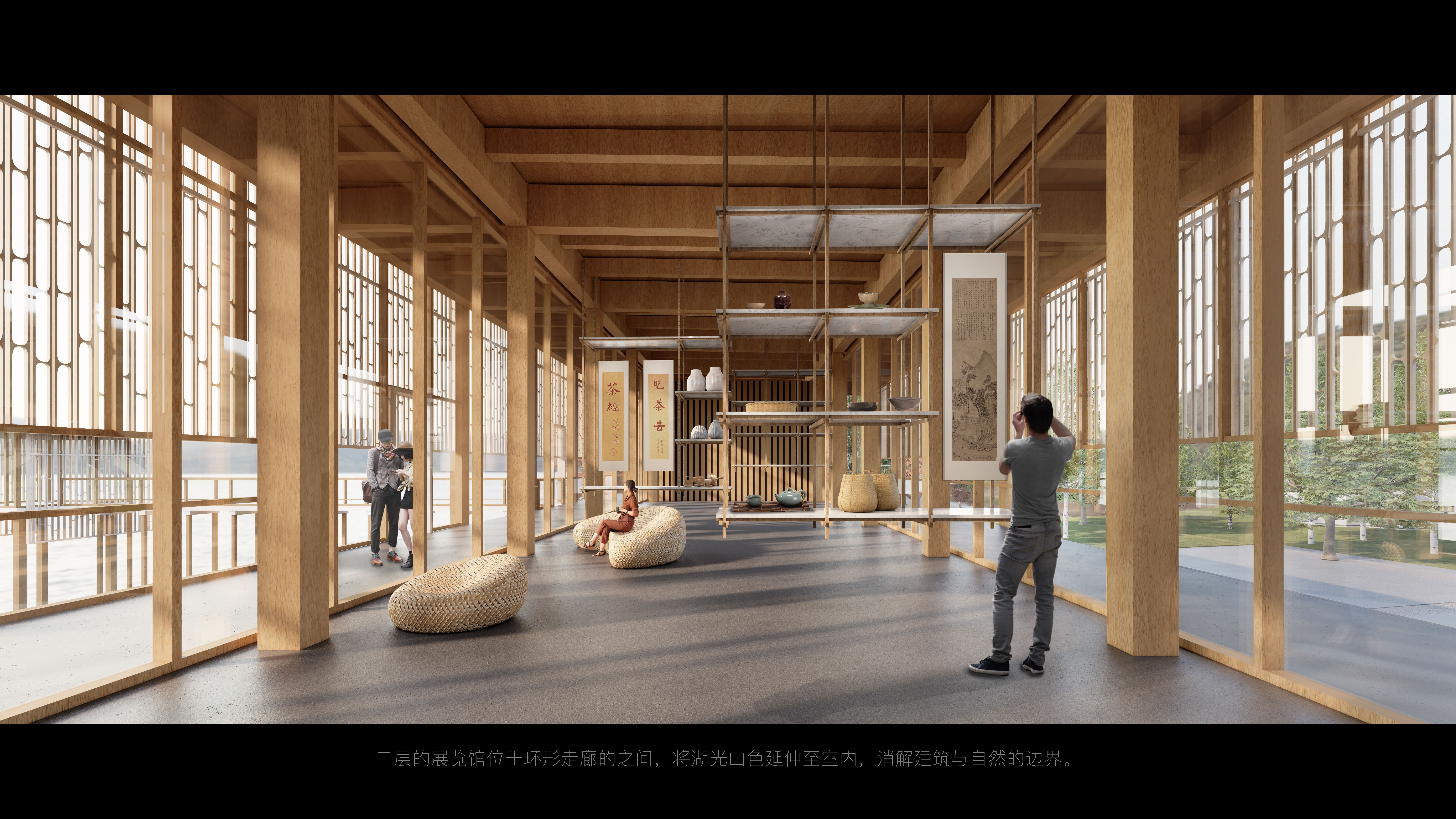 “盈盈一水间。” 以透的形式,让自然穿越其本身,让建筑成为阳光,视线,山和水的滤镜。”泊水“艺展中心从建筑尺度上保留了从广场望向湖面的景观视野。艺展中心的木结构架空廊柱从湖边升起,上方由等距的竹制表皮组成,颇具节奏感的外立面,远远望去仿佛停泊于水上。