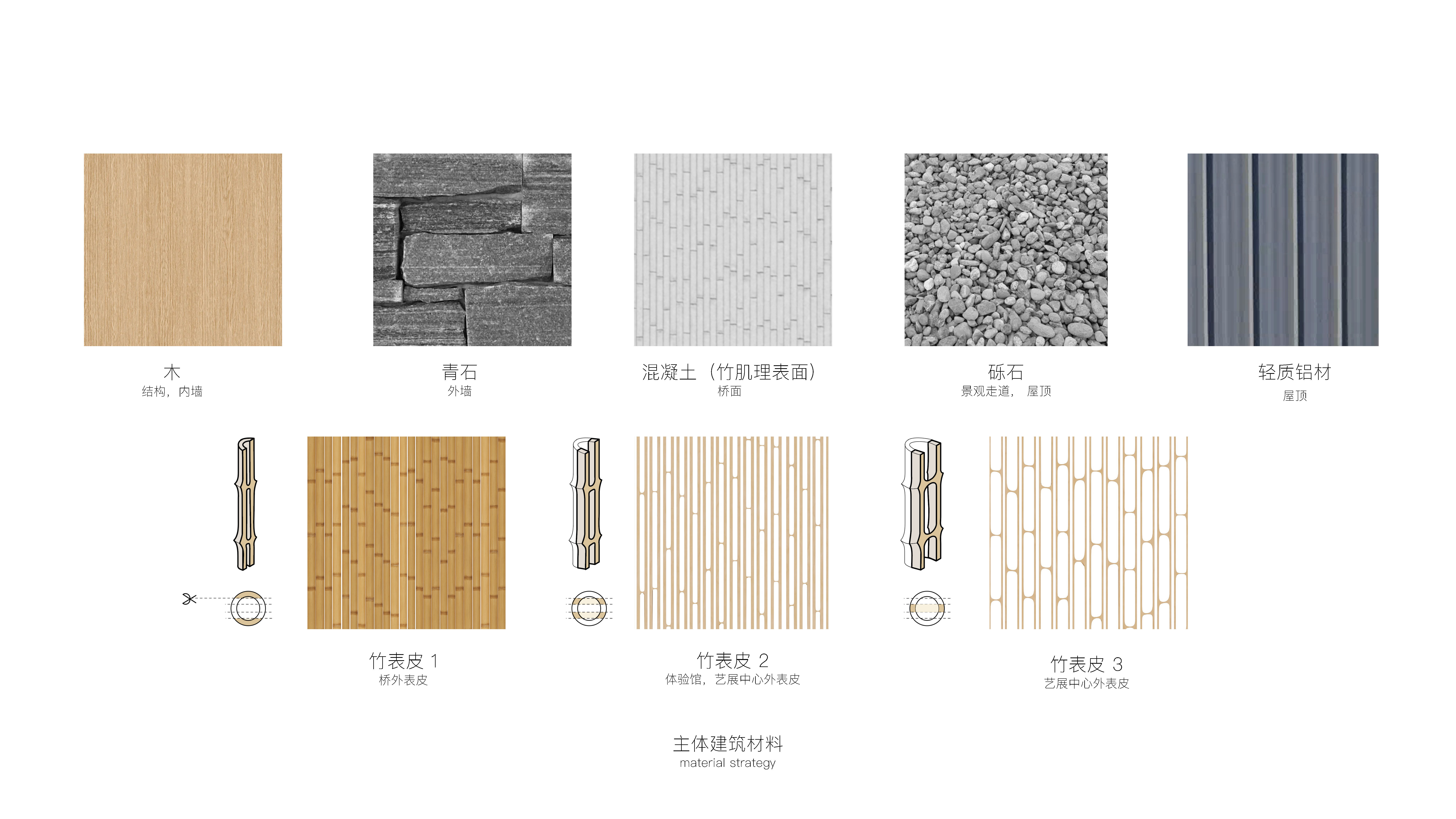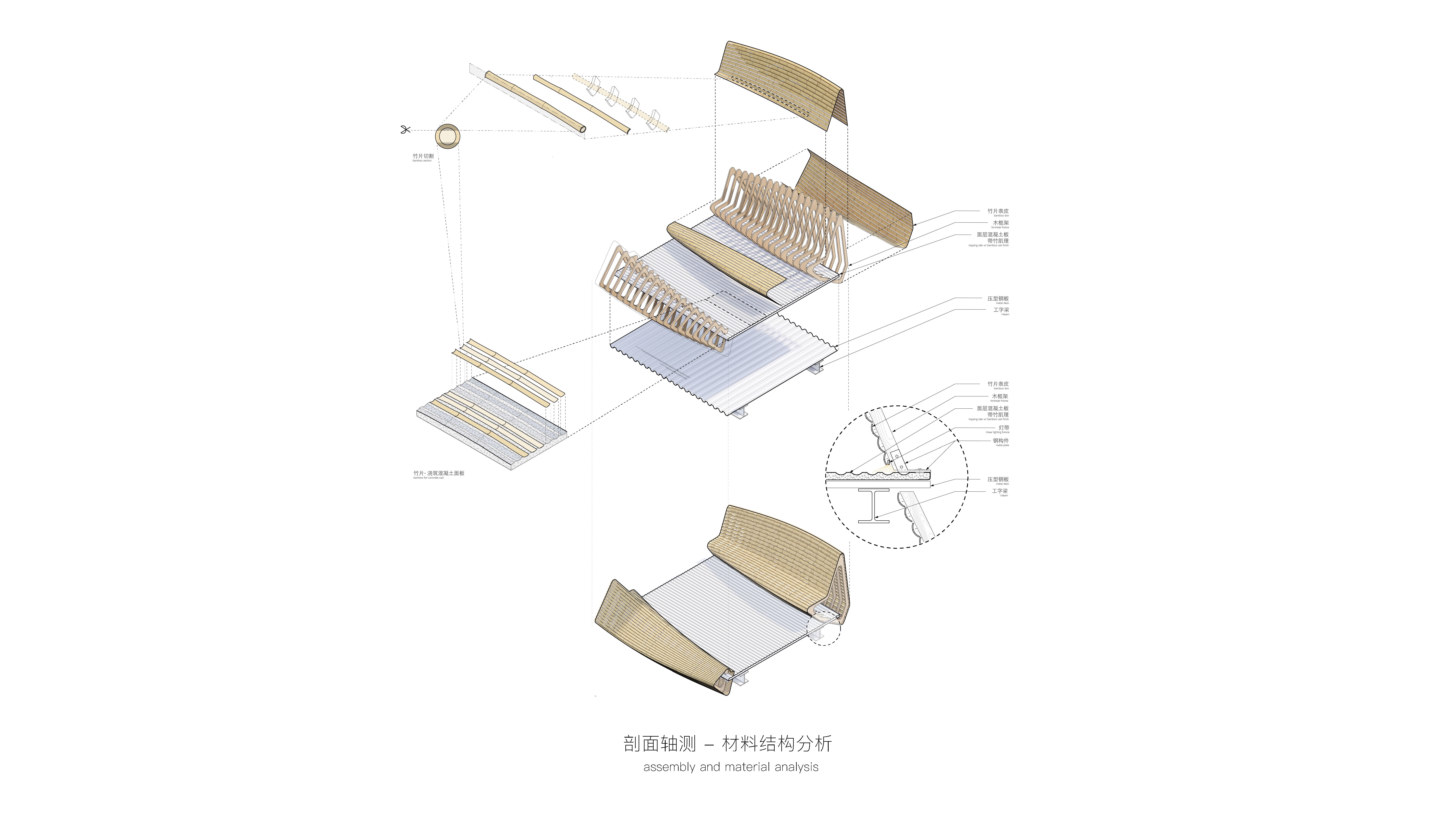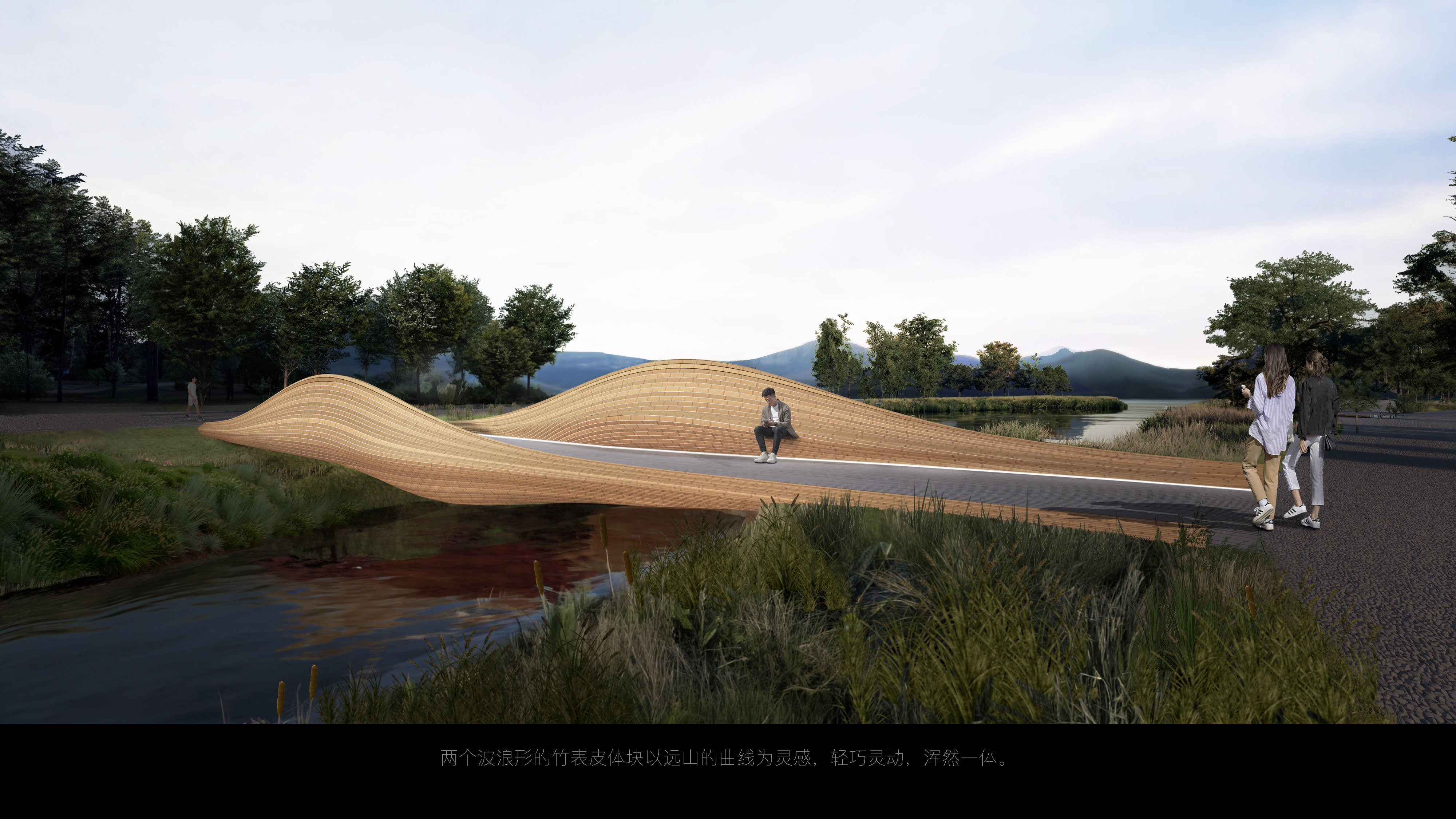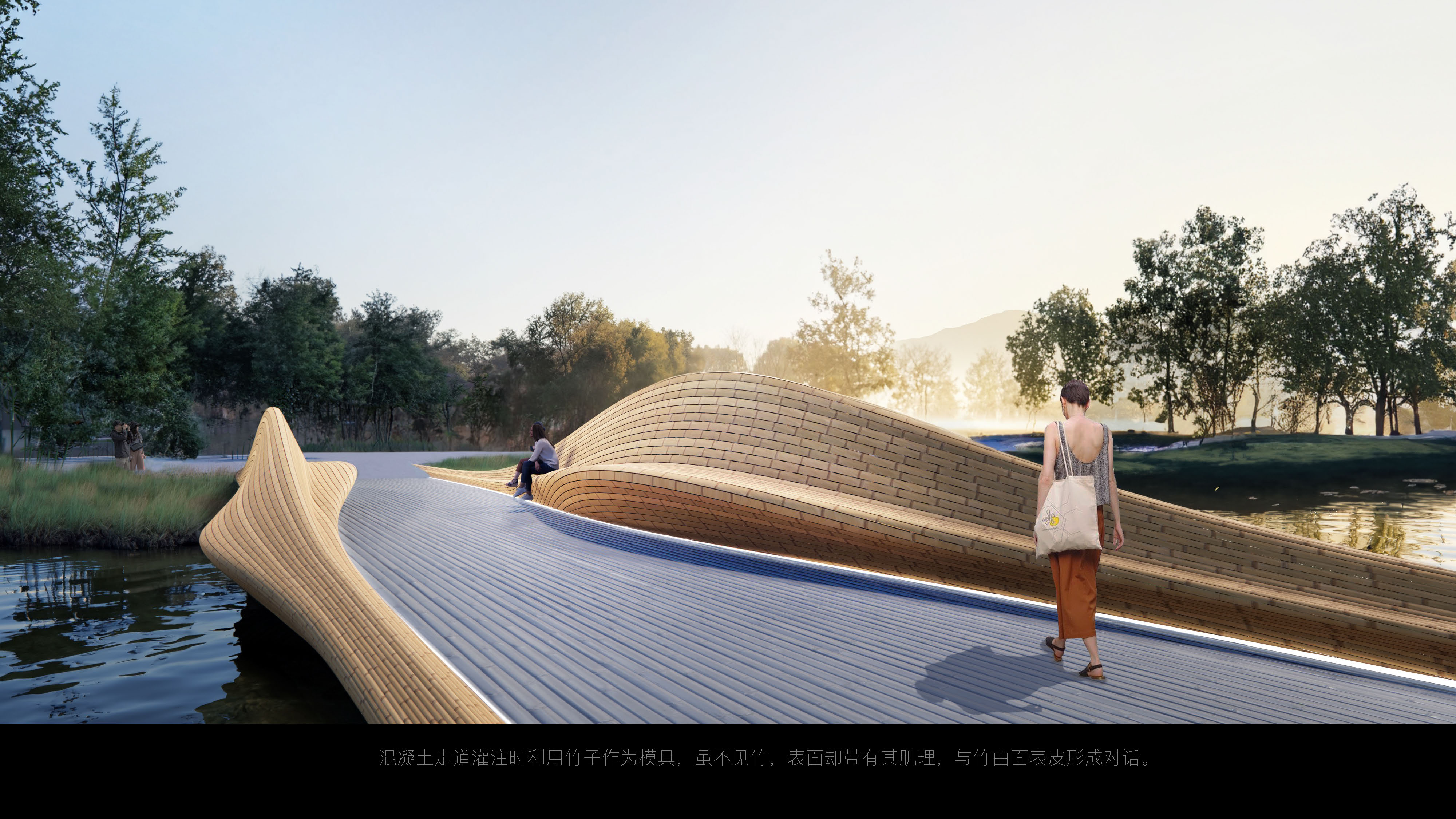 “漫竹”小桥主要由三个部分组成:两个波浪形的竹表皮体块以远山的曲线为灵感,轻巧灵动,卧于水面之上。桥体远观浑然一体,营造场所感。混凝土走道灌注时利用竹子作为模具,虽不见竹,表面却带有其肌理,与曲面表皮形成对话。条状竹表皮由内部的木框结构支撑,通过控制木框的形状可以轻松变换外部的曲线。天然可持续材料的运用,减少对场地内自然环境的影响。“漫竹”意在低造价,低营造技能的框架下,利用参数化最大程度的实现场所感与美感。