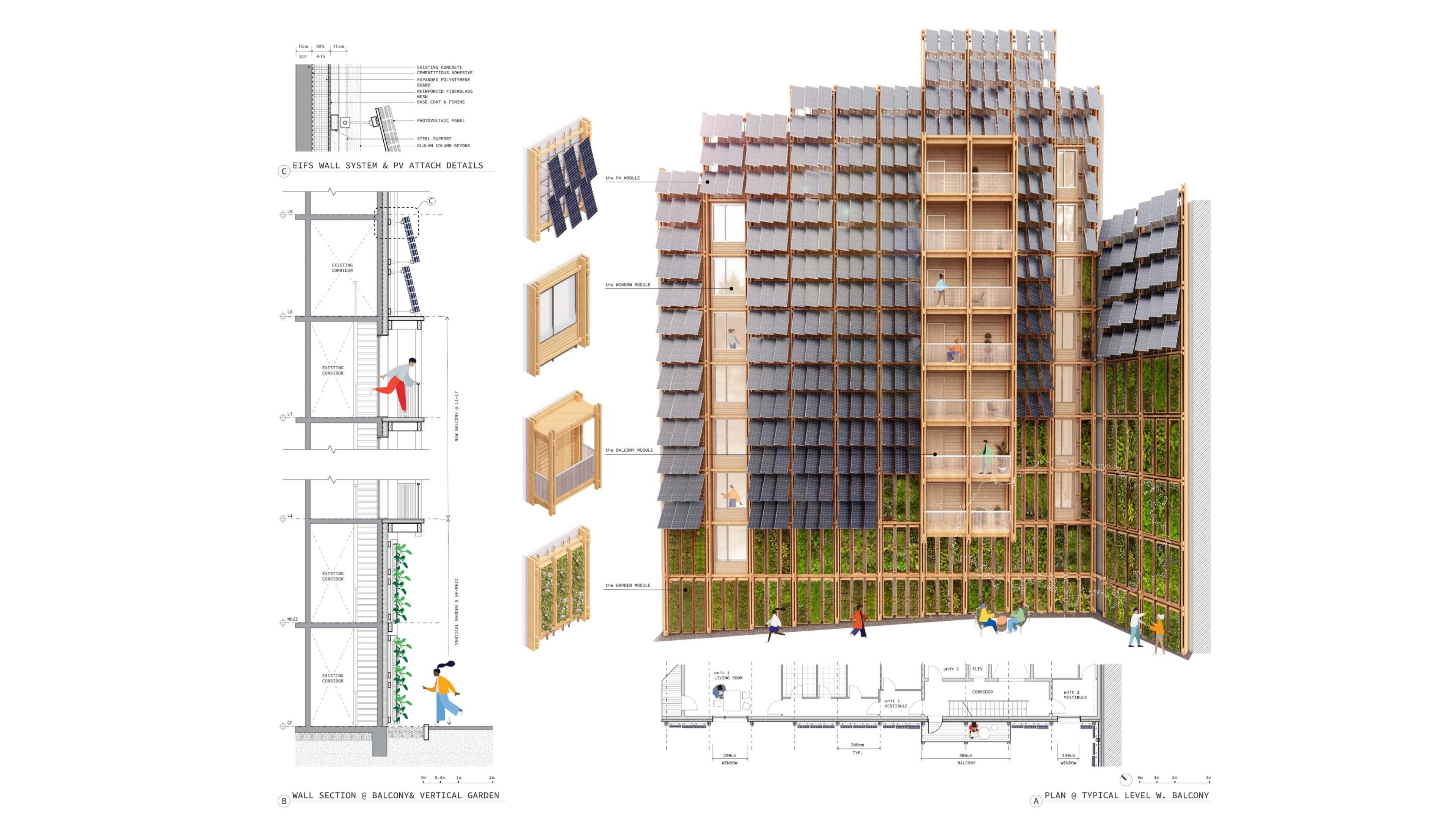 system that stands semi-independently from the existing facade, supported laterally by the original wall. Substructure grids are integrated within the primary grid to support PV modules or vertical garden modules. Windows and balconies are seamlessly integrated within the existing and new structure, and the new EFIS insulation layer enhances the thermal performance of the existing wall.